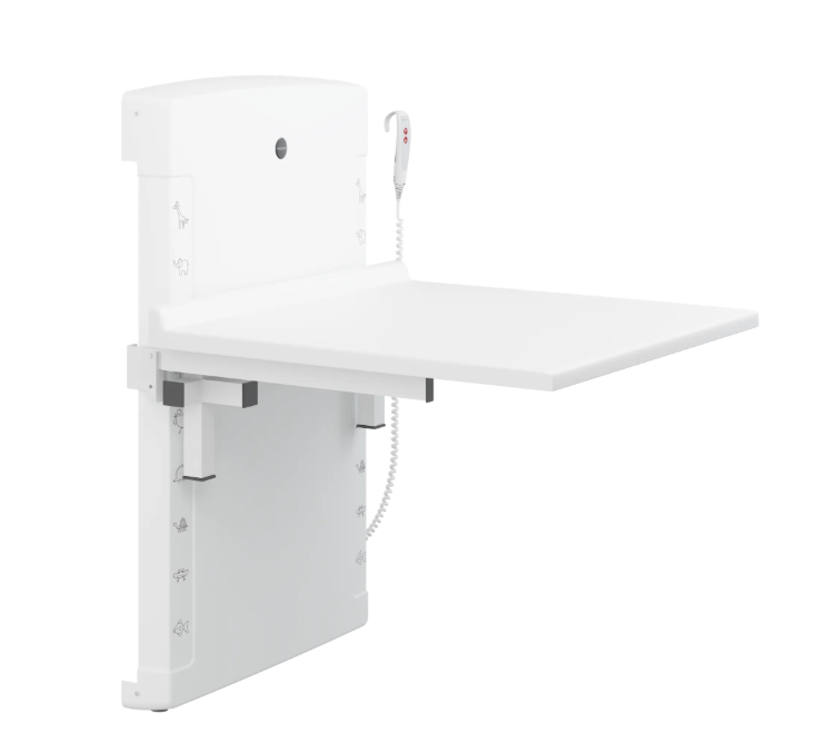 Sérstaklega gagnleg fyrir daggæslu og leikskóla eru lágt upphaf vegghengd skiptiborð, sem hægt er að lækka niður í hæð sem gerir börnum kleift að klifra upp á borðplötuna sjálf.