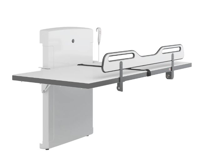 Öryggishandriðið er hannað með vinnuvistfræðilegum neðri miðhluta sem veitir umönnunaraðilanum betri aðgang og vinnuumhverfi við flutning, skipti og klæða notandann.